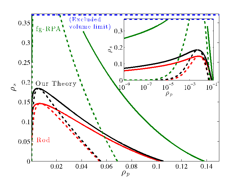 FIGURE: Phase boundaries for symmetric solutions of polyecations and polyanions with added salt; dashed lines demarcate the metastability limit. We compare our theory (black), which accounts for changing chain structure over different concentrations, to the commonly-used fg-RPA (green) which assumes a Gaussian chain structure at all length scales, and rods (red). Note that the fg-RPA suggests phase separations can persist even up to the limit where the solution is very nearly all salt (blue dashed line). Inset shows the overly dilute low-concentration branch predicted by the fg-RPA.